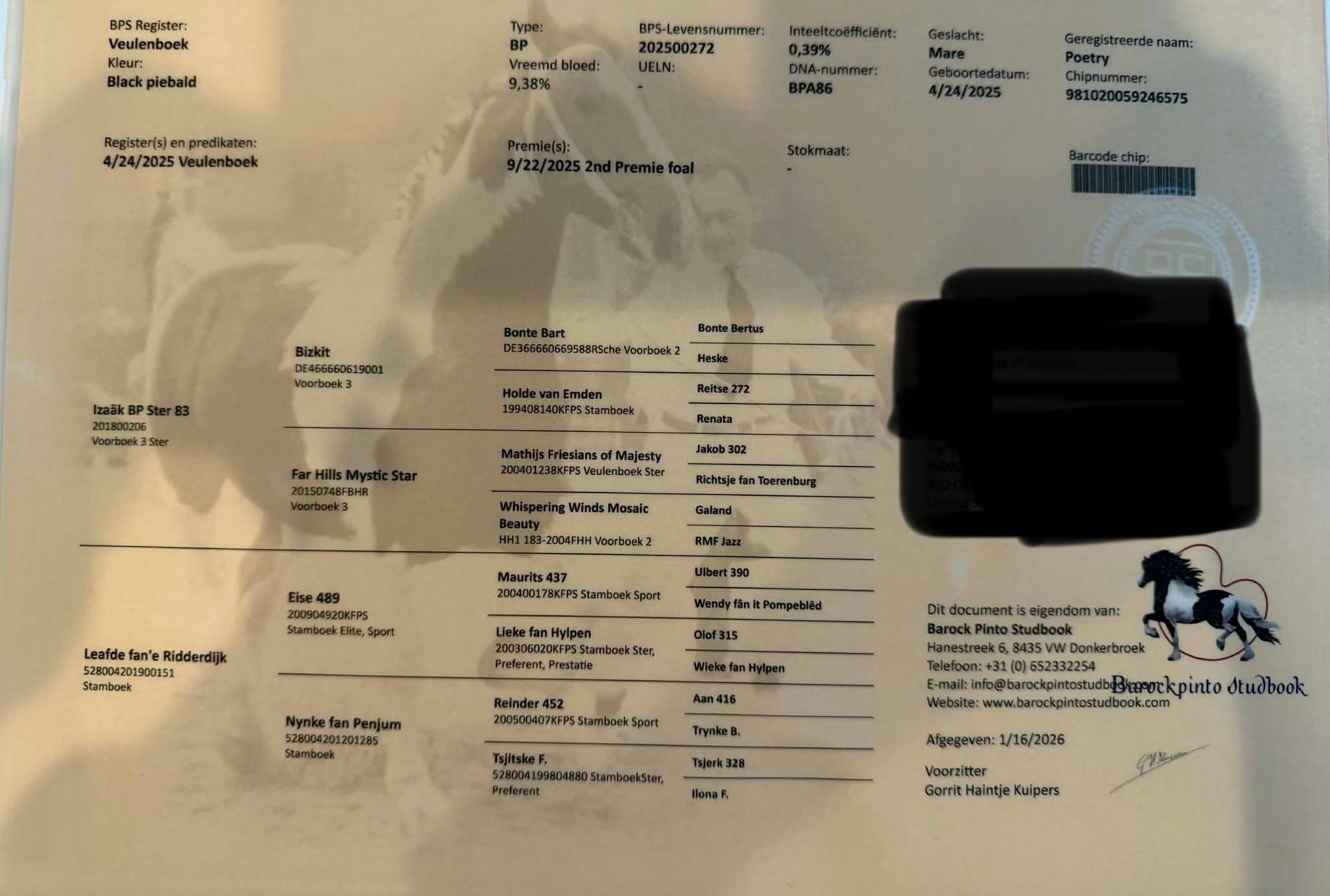 This stunning beauty is 91% Friesian, sired by the incredible Izaak BP83. Her dam boasts a ster predicate and is exquisitely bred (Eise 489 x Render 462). Poetry truly embodies grace and sweetness, always displaying impeccable behavior. 💖